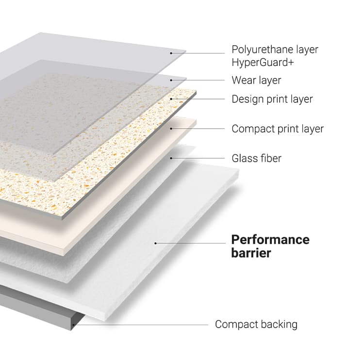 Fiecare strat al pardoselii Iperform 70 este conceput pentru a oferi performanțe maxime. Structura compactă rezistă fără probleme în zonele cu utilizare intensă și este completată de protecțiile Hyperguard+ și Sanitec®, pentru o funcționalitate optimă zi de zi, chiar și în cele mai solicitante condiții.